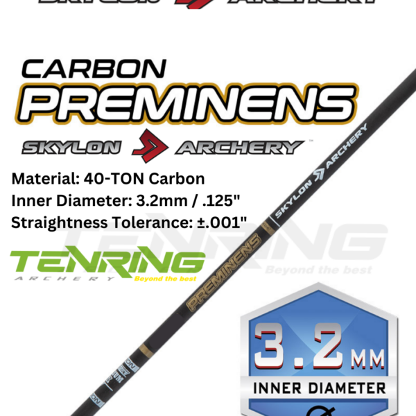 Material: 40-TON Carbon Inner Diameter: 3.2mm / .125" Straightness Tolerance: ±.001" Set of 12 Carbon Arrows from Skylon. These come fletched with Pin Nocks, EP vanes. Suitable for both recurve and compound bows. However if using with compound let us know so we can add a large groove nock. Note- Special Order Item, please allow 2-3 weeks for delivery, however during busy periods this may take longer. To avoid disappointment please check stock levels with our suppliers HERE, if the item is out of stock we will refund or discuss alternatives Skylon Preminens:  Material: 40-ton Carbon Inner diameter: 3.2mm / 0.125" Grains per inch: (spine dependent) Straightness tolerance: ±0.01" Full length: 32" Please see diagram for arrow length, if you are unsure please get in touch.