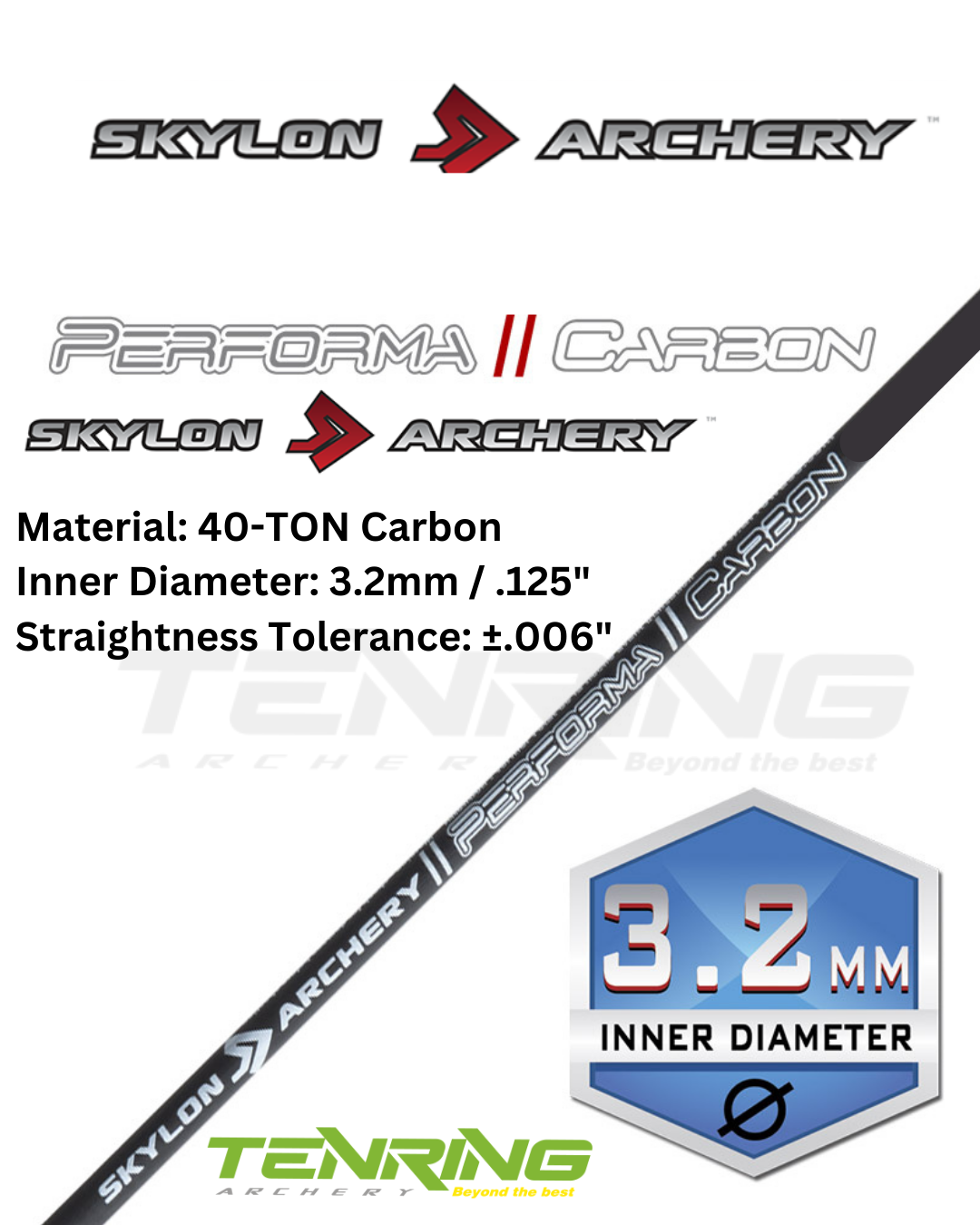 The Skylon Performa arrows are constructed from 40-TON Carbon with a 3.2mm internal diameter this arrow is suitable for both compound and recurve bows to use for outdoor target shooting. Supplied as a set of 12.
